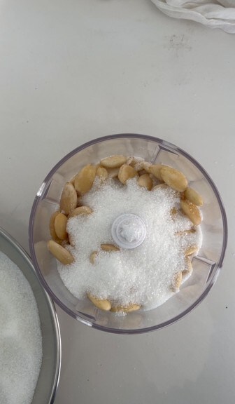 Nun nach und nach die Mandeln zusammen mit dem Zucker zu Pulver mahlen.