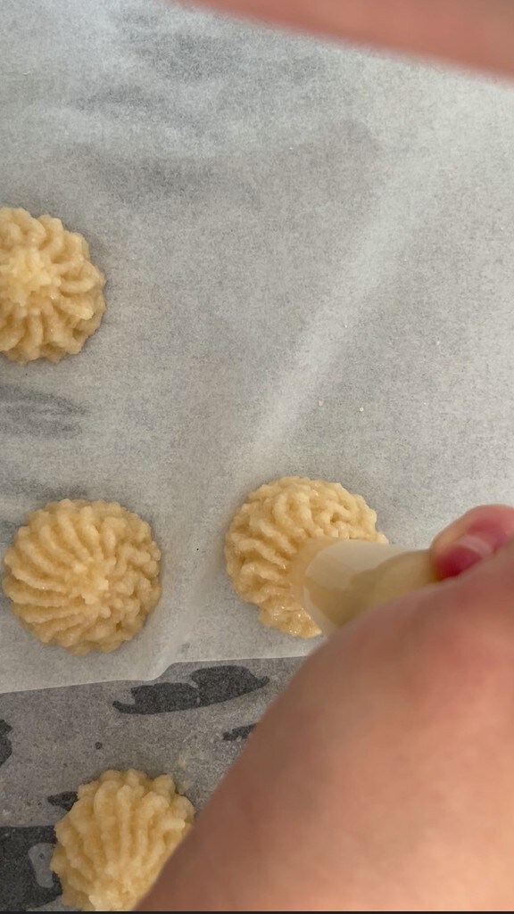 Auf einem mit Backpapier ausgelegten Blech unsere Plätzchen formen, indem der Spritzbeutel leicht vertikal gedrückt wird.