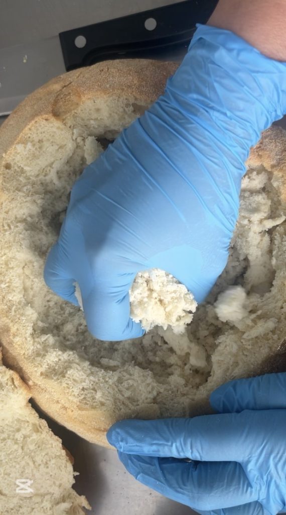 Das Brot so zuschneiden, dass es als Behälter dient, und das Innere entfernen.