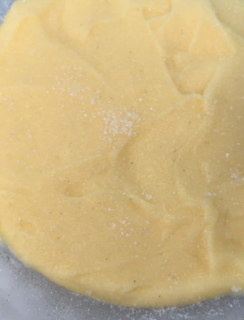 In eine Schüssel zum Abkühlen geben und mit Zucker bestreuen. Diese Technik verhindert das Bilden einer Haut auf der Creme.