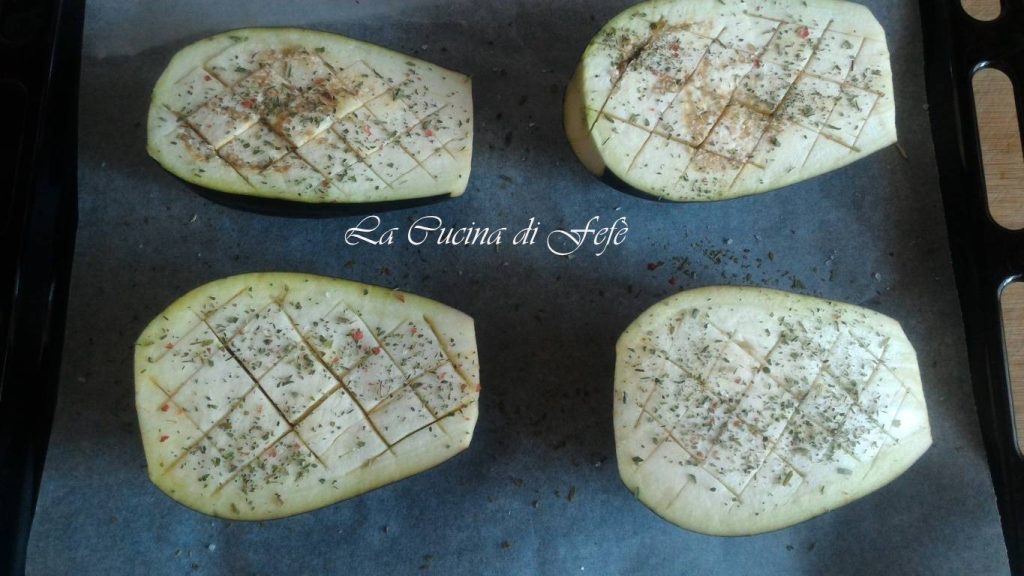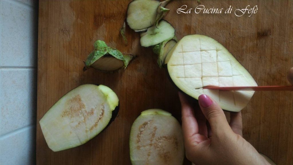• Wascht die Auberginen unter fließendem Wasser, trocknet sie mit Küchenpapier ab, entfernt den Stiel und halbiert sie in der Länge. Schneidet das Fruchtfleisch kreuzweise ein, um Rauten zu formen, ohne das Messer zu tief einzuführen.