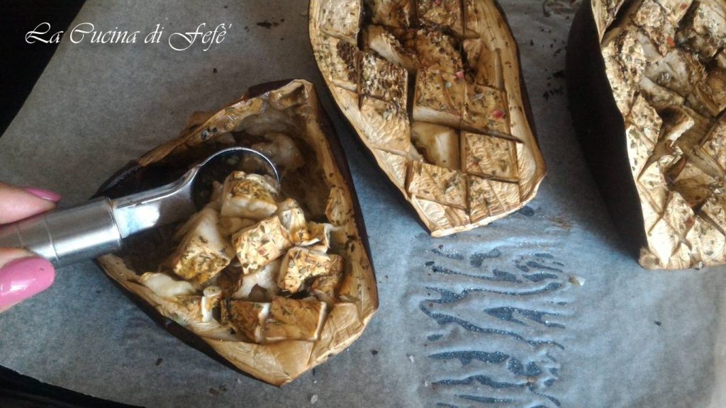 • Sobald sie gar sind, schaltet den Ofen aus, lasst sie abkühlen und holt mit einem Ausstecher das ganze Fruchtfleisch heraus.