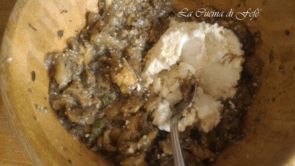 • In eine andere große Schüssel gebt ihr das Auberginenfruchtfleisch zusammen mit dem Ei und dem Ricotta, den ihr zuvor mit einem Sieb gut abtropfen lassen habt.