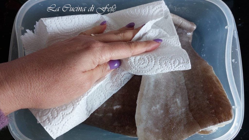 Um den Baccalà alla ghiotta zuzubereiten, spüle zuerst den Fisch ein letztes Mal ab, nachdem du ihn eingeweicht hast, und tupfe ihn anschließend mit Küchenpapier trocken, ohne die Haut zu entfernen.