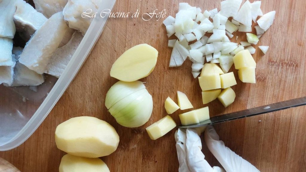 Wasche und schäle die Kartoffeln, dann schneide sie in Würfel; putze auch die Zwiebel und schneide sie in feine Scheiben.