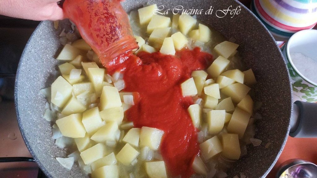 Füge die Kartoffeln hinzu und lasse sie ein paar Minuten anbraten, dann gieße etwa 4 Kellen heißes Wasser dazu, decke mit dem Deckel ab und koche bei mittlerer Flamme etwa 10′, oder bis sie weich sind.