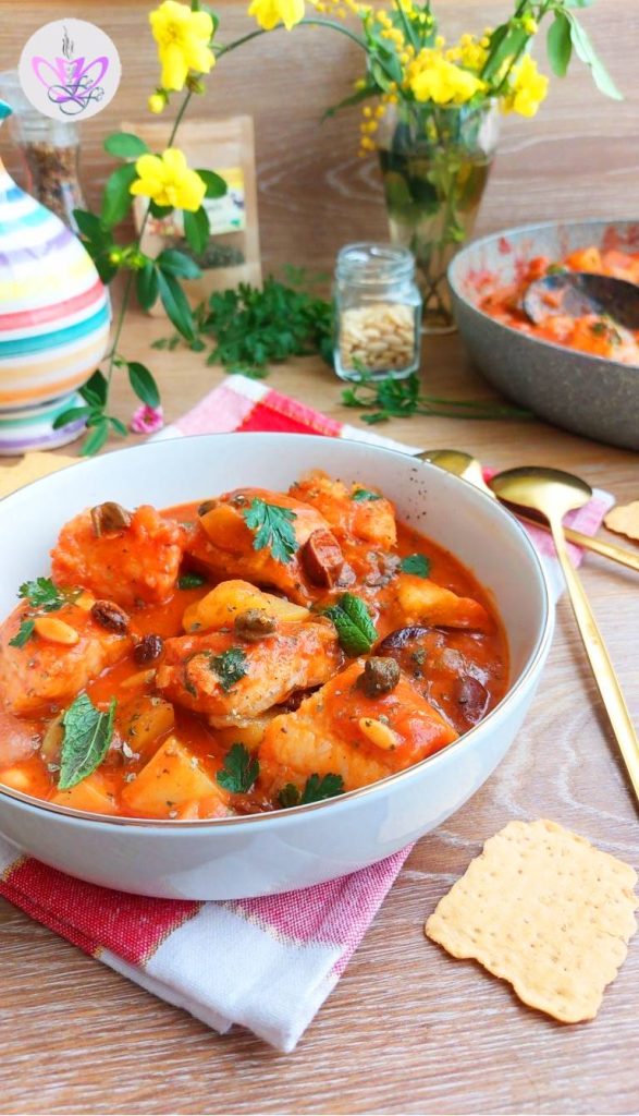 Es handelt sich um ein Fisch-Hauptgericht, bei dem der Kabeljau die Hauptrolle spielt, angereichert mit Zutaten, die die Aromen und Düfte meines Landes hervorrufen: Kapern, Oliven, Sultaninen und Pinienkerne. Ein köstliches Gericht unserer maritimen Tradition, bereichert durch eine köstliche Sauce, die den Fisch weich und saftig hält. Es ist perfekt für ein unwiderstehliches Schlemmen mit gerösteten Brotscheiben oder Croutons und eignet sich auch ideal als Sauce für deine Fischgerichte.