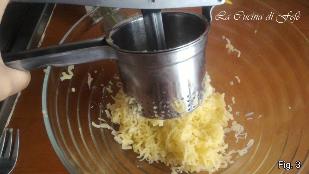 • Nach dem Kochen die Kartoffeln durch eine Kartoffelpresse geben, bis sie zu Püree werden.