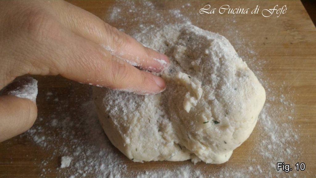 • Dann auf eine Arbeitsfläche geben, dabei nach und nach den Rest des Mehls hinzufügen.