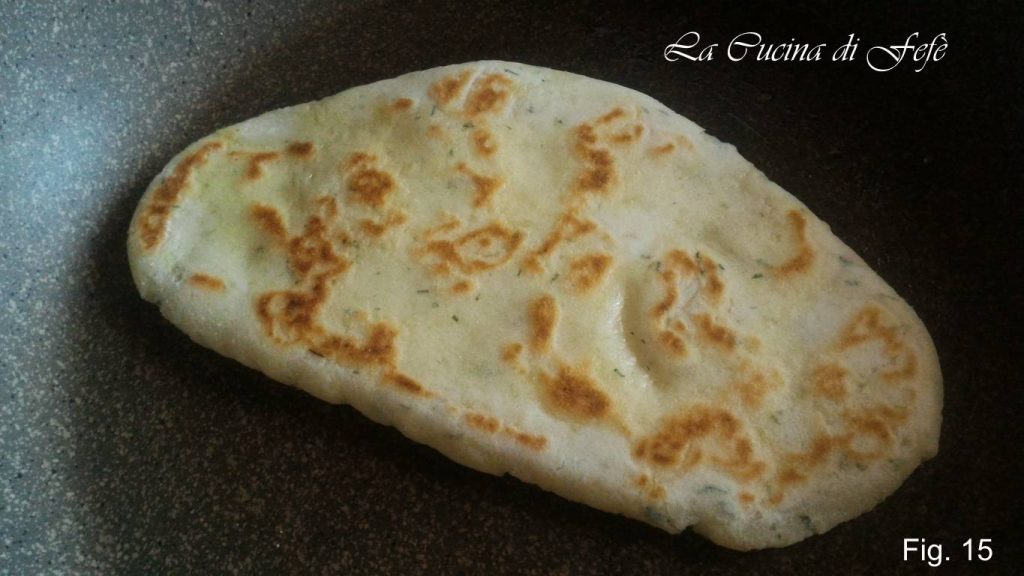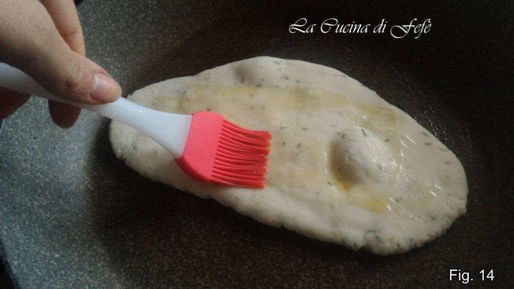 • Backen Sie das türkische Brot in einer heißen, mit Öl bestrichenen antihaftbeschichteten Pfanne ca. 2 Minuten bei niedriger Hitze, bestreichen Sie die Oberfläche mit einem Splash Öl und decken Sie es mit einem Deckel ab.