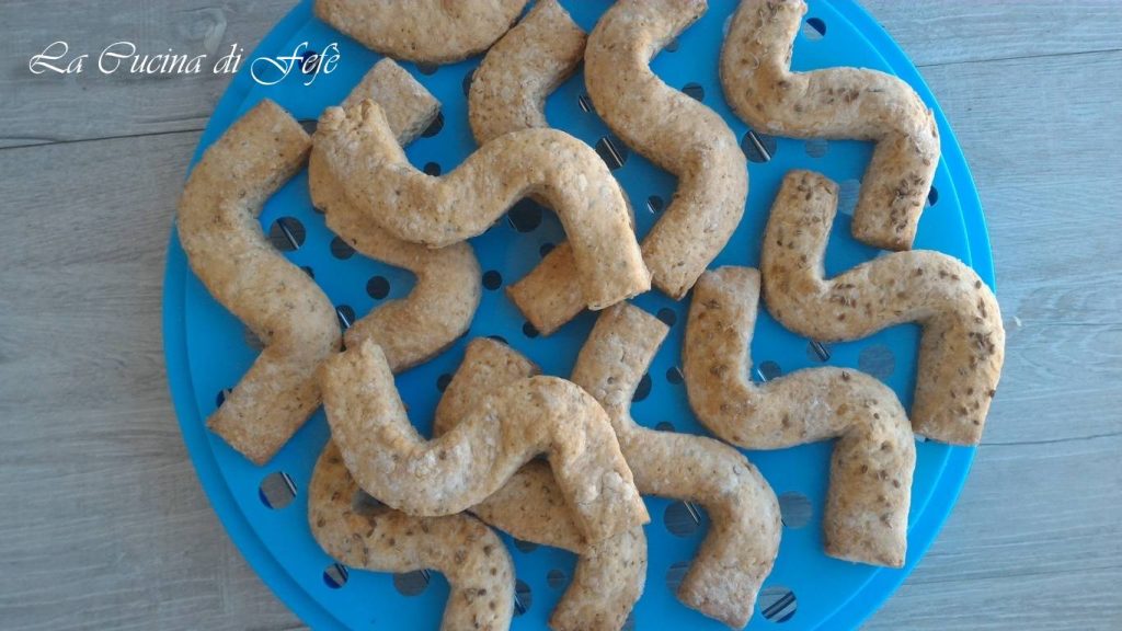 • Jeden Streifen biegen, um die typische S-Form zu erhalten, und diese Kekse auf einem mit einer mikroperforierten Matte oder Backpapier ausgelegten Backblech anordnen.