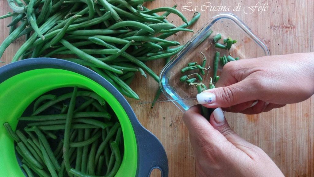 Reinige die grünen Bohnen, indem du die Enden abschneidest und die Fäden entfernst (nur wenn sie zu hart sind). Du kannst dabei auch ein Messer oder eine Schere zur Hilfe nehmen.