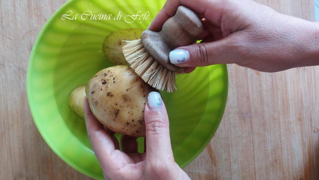 Kümmere dich jetzt um die Kartoffeln: Benutze eine Lebensmittelbürste, um die Schale unter kaltem fließendem Wasser gründlich zu reinigen und Schmutzreste sowie Verunreinigungen zu entfernen.