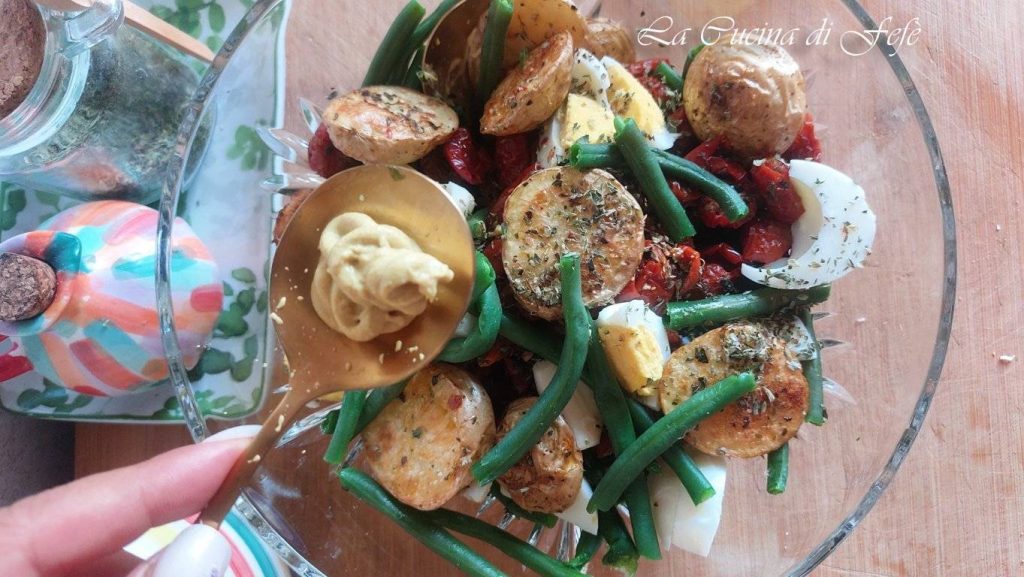 Frische und nahrhafte Gerichte zuzubereiten und häufig zu verzehren, ist immer eine ausgezeichnete Lösung, um die Hitze zu bekämpfen und sich an Sommertagen abzukühlen! Unter den vielen kalten Salaten, die in diesen Jahren ausprobiert wurden, ist dieser mit grünen Bohnen, getrockneten Kirschtomaten, hartgekochten Eiern und gebackenen Kartoffeln nicht nur einer der schmackhaftesten, sondern auch einer der leichtesten und gesündesten! Perfekt für alle, die sich eine kleine Mahlzeit gönnen möchten, vielleicht zum Mitnehmen ins Büro oder an den Strand, um sie unter dem Sonnenschirm zu genießen! Dank der Zugabe von Kartoffeln, die nicht gekocht, sondern im Ofen mit einer speziellen Würzung zubereitet werden, wird das Endergebnis wirklich köstlich und unwiderstehlich sein! Ein vegetarisches Gericht, das super vielseitig ist und daher je nach Geschmack und Ernährungsbedürfnissen weiter verfeinert oder variiert werden kann.