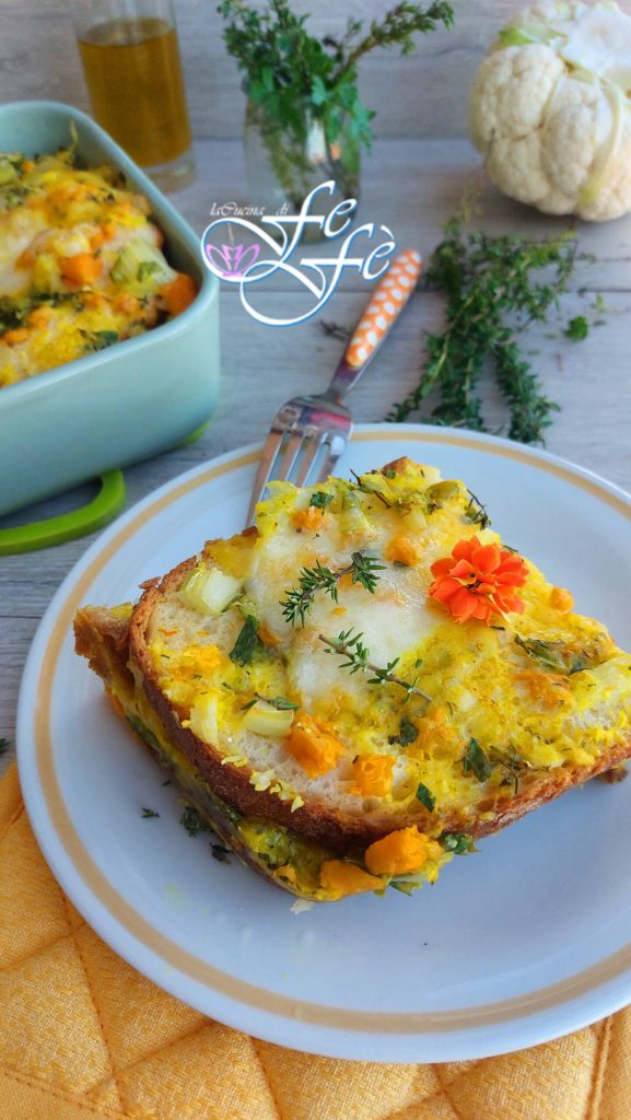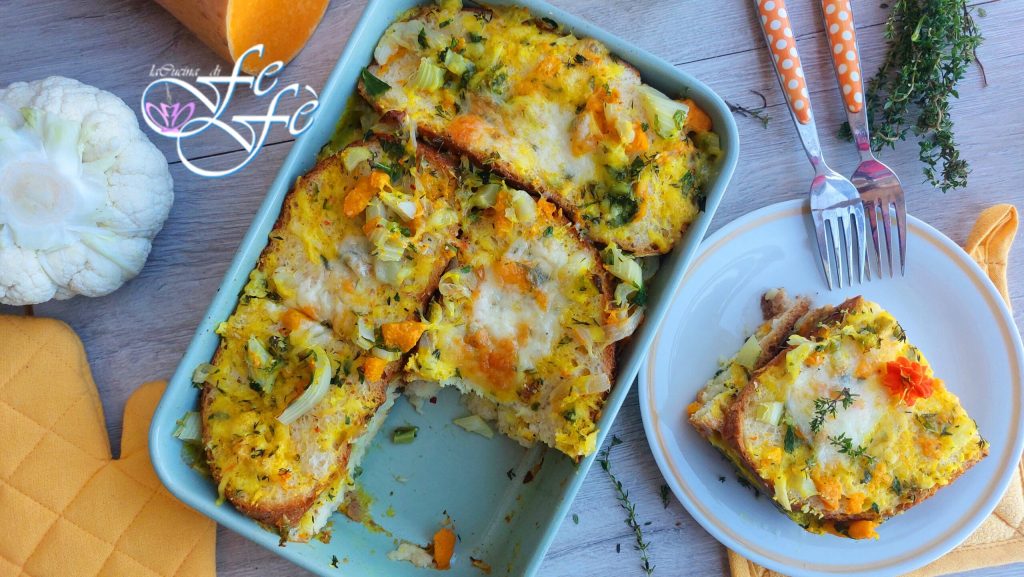 Wenn ihr altbackenes Brot zu Hause habt und es nicht schon wieder zu Paniermehl verarbeiten möchtet, seid ihr hier genau richtig! Ihr wisst bereits, wie sehr ich mich bemühe, Lebensmittelverschwendung zu minimieren, und wie sehr Rezepte der einfachen Küche dazu beitragen können! Sie sind zweifellos eine unglaubliche Ressource für unser Budget und tragen dazu bei, die Umweltbelastung zu verringern! Der Brotauflauf, den ich euch heute vorschlage, ist inspiriert von der berühmten galluresischen Suppe, einem einfachen und geschmackvollen Gericht aus Sardinien, das auf Schaf- oder Lammbrühe, altem Brot und Käse basiert. In meinem Fall wird es zu einem Recyclinggericht, indem die Abfälle des Blumenkohls genutzt werden. Die Brühe, die das Brot Schicht für Schicht aufnimmt, wird daher streng vegetarisch sein, dank des Kürbis und der Zwiebeln, die sie bereichern! Viel Thymian und Petersilie sowie der Asiago werden den Rest erledigen. Dieses Gericht wird euch mit seinem intensiven Geschmack, seiner Weichheit beim Schneiden und gleichzeitig mit der goldenen Kruste, die sich an der Oberfläche bildet, überraschen! Es wird ein unglaubliches Wohlfühlessen sein, das man an kalten Wintertagen und nicht nur genießen kann!