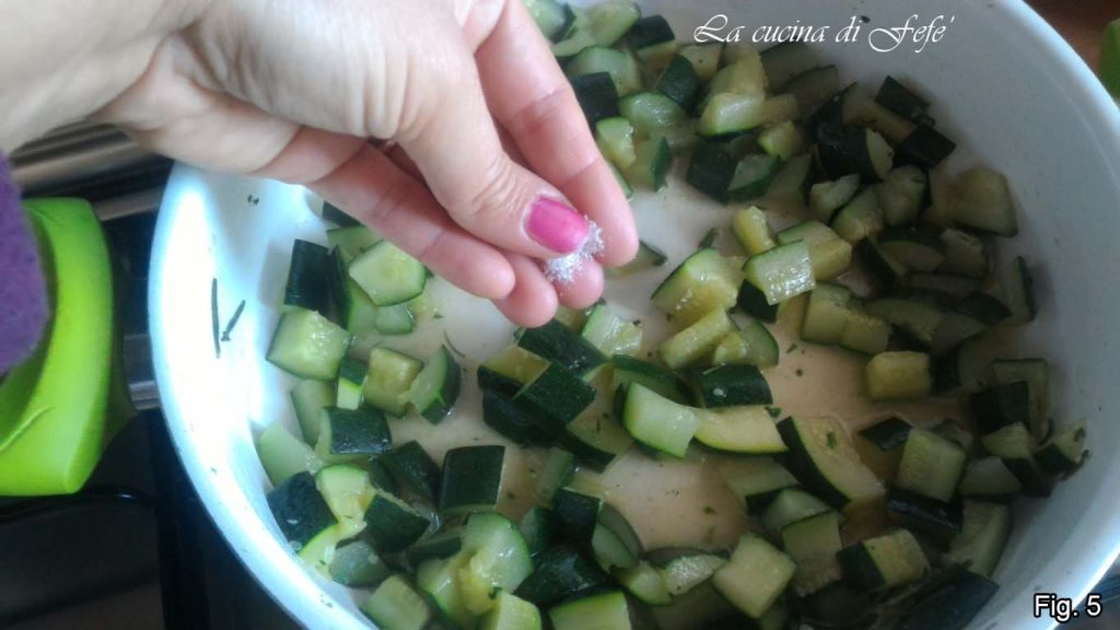 In einer beschichteten Pfanne ein Knoblauchzehe mit drei Esslöffeln Öl goldbraun anbraten, einen ganzen Rosmarinzweig, die Mentuccia mit den Händen zerpflücken und die Chiliflocken hinzugeben. Gebt dann die gewürfelten Zucchini dazu und bei Bedarf etwas Wasser. Deckt die Pfanne ab und lasst alles bei schwacher Hitze etwa 5 Minuten schmoren.
