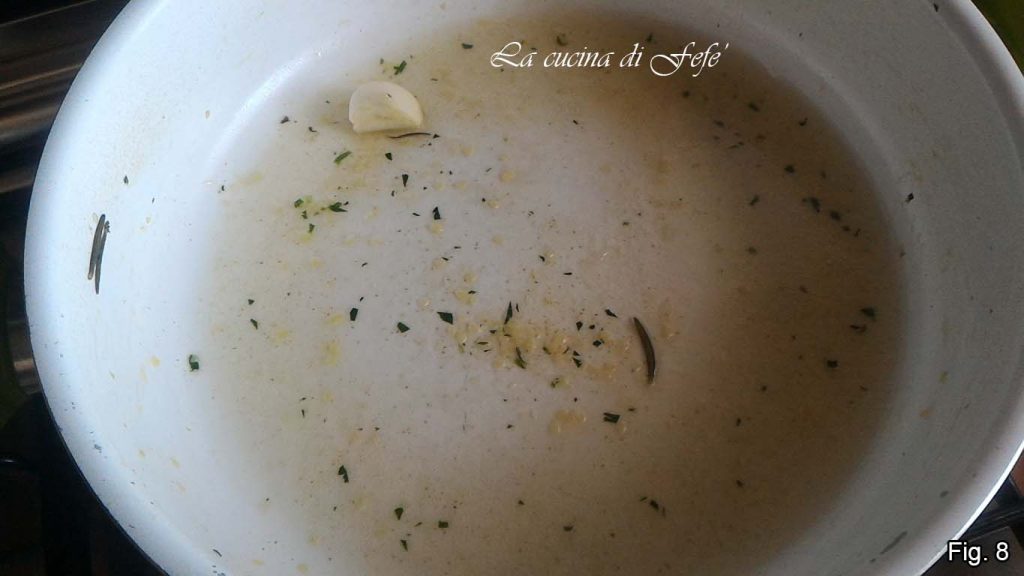 In derselben Pfanne, in der ihr die Zucchini gekocht habt, das zweite Knoblauchzehe mit weiteren drei Esslöffeln Öl anbraten.