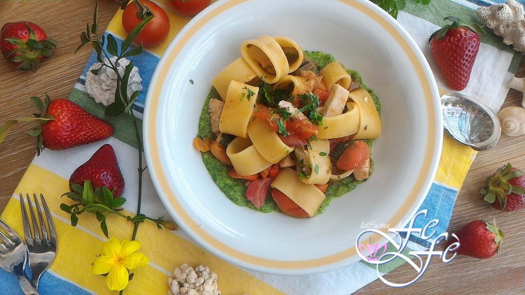 Und voilà… die Calamarata mit Schwertfisch und Erdbeeren in Zucchini-Creme ist bereit zum Genießen!