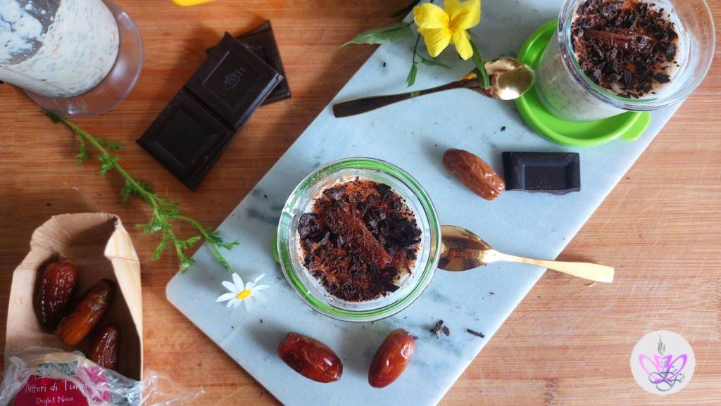 Wie ich hier auf dem Blog und in den sozialen Medien schon mehrmals erzählt habe, ist in letzter Zeit für alle, die ein gesundes und sättigendes Frühstück lieben, der Chia-Pudding sehr beliebt, eine Art cremiger Pudding aus Mittelamerika, der aus Chiasamen besteht! Diese kleinen, dunklen Samen sind reich an essentiellen Fettsäuren wie Omega-3 und Omega-6, Ballaststoffen und Mineralien. Der tägliche Verzehr ist eine gute Wahl für ein super nahrhaftes und ehrliches Frühstück. Außerdem ist er ideal für alle, die es eilig haben, da er kein Kochen erfordert, sondern nur das Einweichen der Samen in einer beliebigen Flüssigkeit für mindestens 30 Minuten. Wenn du ihn jedoch am Abend zuvor zubereitest, ist es noch besser! Heute schlage ich dir eine sehr besondere Version mit Datteln vor, die als natürlicher Süßstoff für diese Zubereitung dienen werden, und Zimt. Um das Ganze noch verführerischer zu machen, habe ich Schokoladenstückchen hinzugefügt, die die Laune und Konzentration verbessern können und eine energetische Unterstützung während deines Tages bieten! Probiere es zum Frühstück, als Dessert nach dem Essen oder als gesunden Snack, wenn du dir etwas Süßes gönnen möchtest! Du wirst es lieben!