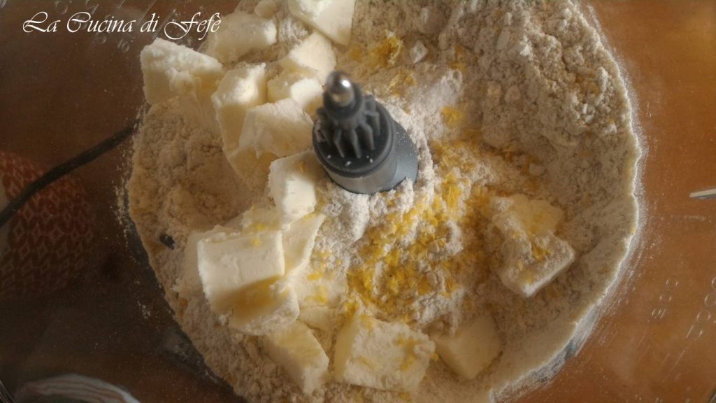 In den Behälter einer Küchenmaschine die beiden Mehle mit einer Prise Salz, der geriebenen Schale einer unbehandelten Zitrone und der kalten Butter in Stücken mischen.