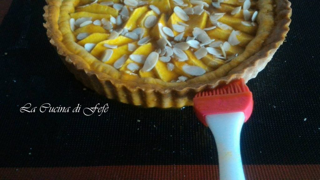 Stechen Sie den Boden mit den Zinken einer Gabel ein und füllen Sie das Innere mit der Aprikosenkonfitüre, indem Sie sie gleichmäßig mit einem Spachtel verteilen.