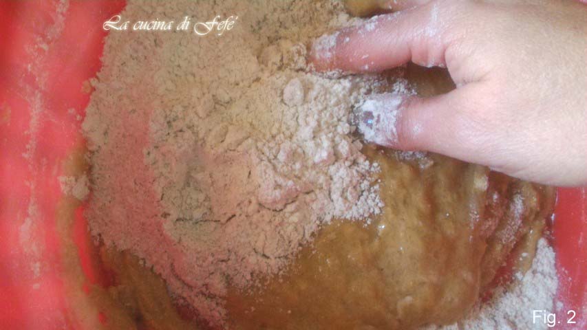 • Mit einem Holzlöffel anfangen zu rühren, dann nach und nach das Mehl dazugeben und weiter mit den Händen arbeiten.