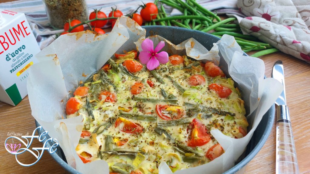 Stimmt ihr mir zu, dass die Reste-Rezepte, abgesehen davon, dass sie gut für den Geldbeutel und die Umwelt sind, die wahren Stars eines Mittag- oder Abendessens werden können? Abfallbekämpfung war für mich schon immer eine Art Mission, und jetzt erst recht möchte ich mein öffentliches Profil nutzen, um möglichst viel Bewusstsein zu schaffen! Wir sind alle gefordert, uns mit Lebensmittelverschwendung auseinanderzusetzen und das Prinzip umzusetzen, dass Essen nicht weggeworfen werden sollte! In meinem speziellen Fall hatte ich Eiweißreste von einem vorherigen Rezept und etwas Gemüse im Kühlschrank, das kurz vor dem Verderben war! Mit diesem Eiweißkuchen habe ich ihnen neues Leben eingehaucht, gespart und ein einfaches, leichtes und geschmackvolles Abendessen zubereitet! Eine Idee, die das Nützliche mit dem Angenehmen verbindet, denn sie ist wirklich lecker und wird das perfekte Abendessen für die Familie oder eine interessante Möglichkeit, ein Mittagessen zu eröffnen, indem man es mit dem Aperitif kombiniert. Der Teig ist unglaublich einfach, und der Geschmack recht mild, fast neutral. Daher ist es wirklich ein vielseitiger Kuchen, da alles von der Füllung abhängt. Ich habe grüne Bohnen, Lauch und Kirschtomaten verwendet, um dann mit meiner geliebten Provola Silana Würze zu verleihen! Aber ihr könnt nach Belieben andere Gemüsesorten oder Wurstwaren hinzufügen. Probiert es aus und sagt mir Bescheid!