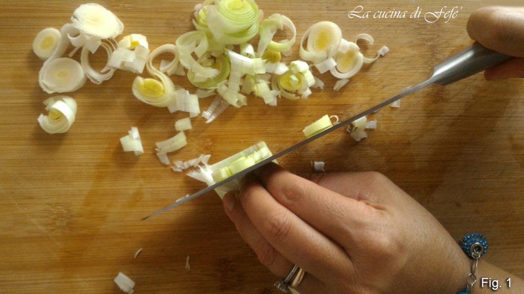 Beginnen Sie mit dem Putzen des Lauchs, indem Sie die äußeren Blätter und die bärtige Spitze an der Basis entfernen. Waschen Sie ihn gut und schneiden Sie ihn auf einem Schneidebrett in nicht zu dicke Ringe (Abb. 1).