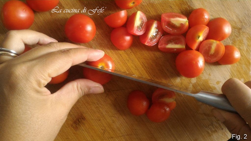 Waschen und vierteln Sie die Kirschtomaten, wenn sie besonders groß sind, oder halbieren Sie sie, wenn sie kleiner sind (Abb. 2).