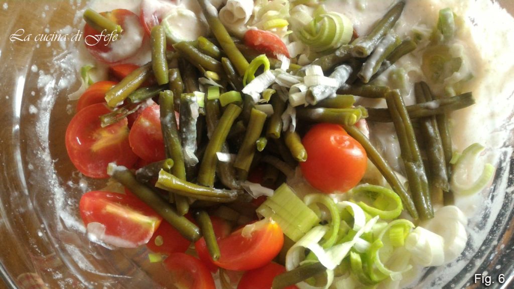Fügen Sie das Gemüse hinzu, also Lauch, Kirschtomaten und die zuvor gekochten und der Länge nach halbierten grünen Bohnen, und mischen Sie gut (Abb. 6).