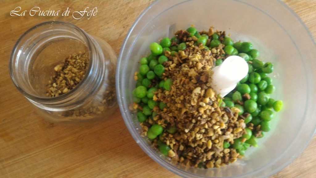 • Übertragen Sie die Erbsen in einen Mixer und fügen Sie auch das Pistaziengranulat hinzu.