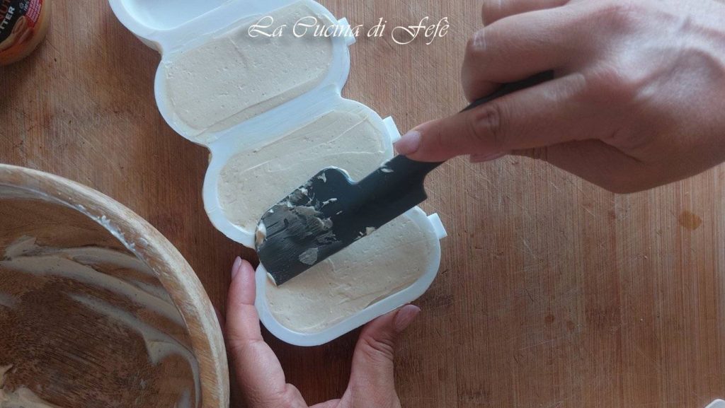 Verteile die erhaltene Creme in die speziellen Formen, stelle sicher, dass sie gut gefüllt sind, indem du die Form wenn nötig schüttelst, um die Mischung richtig hineinzubekommen, dann glätte sie mit dem Spatel oder einer Teigkarte.