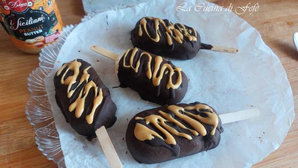 Seit einigen Jahren kaufe ich keine Eis am Stiel mehr, weil ich sie mir zu Hause handwerklich zubereite, mit wenigen und hochwertigen Zutaten! Ich muss sagen, sie haben mir alle große Zufriedenheit bereitet! Sie sind einfach und schnell zuzubereiten, man muss natürlich die Zeit für das Einfrieren einrechnen. Das einzige Manko? Sie sind schnell weg! Diese mit Erdnussbutter sind super lecker, mit einer reichhaltigen und cremigen Füllung aus Frischkäse und einem leckeren, knusprigen Überzug aus Zartbitterschokolade. Ein toller Trick, um eine pastöse und cremige Mischung zu erhalten, die ähnlich wie Sahne ist, aber ohne sie zu verwenden. Ein schlauer Weg, um die Zugabe von zu vielen gesättigten Fetten und der schädlichen Kondensmilch zu umgehen! Tatsächlich enthalten die meisten industriellen Versionen hohe Mengen an Zucker, Konservierungsmitteln und anderen Zusatzstoffen, die das Nährwertprofil verändern. In meinen kleinen Eis am Stiel findest du hingegen nur wenige Gramm Süßstoff für einen gesunden Snack ohne Blutzuckerspitzen! Mit diesen Mengen erhältst du 4 mittelgroße Eis am Stiel, aber wenn du nicht meine Form verwendest, könnte dir noch etwas für zwei weitere kleine Eis übrig bleiben! Probiere sie aus, sie sind genial!