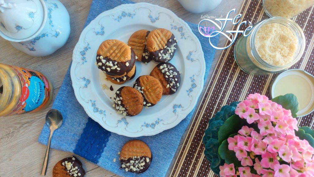 Wie ich euch oft erzähle, ist mein Verlangen nach Süßem immer um die Ecke, aber wenn ich jedes Mal solchen Gelüsten nachgeben würde, wäre das nicht gut für meine Gesundheit, es sei denn, ich fände einen Kompromiss bei der Kombination der Zutaten in meinen Zubereitungen! Diese Kekse sind genau das, was nötig ist, um das Ziel zu erreichen. Ich habe sie zufällig entdeckt und mich buchstäblich verliebt, zunächst weil sie mit nur 3 Zutaten hergestellt werden, und dann, weil sie unglaublich einfach zu machen sind, man braucht nur eine Schüssel und einen Löffel, was nicht schadet, glaubt ihr nicht? Aber da ist noch mehr! Diese Kekse sind auch vegan, laktose- und glutenfrei, da sie kein Mehl außer Mandelmehl, keine Eier, keinen raffinierten Zucker, keine Milchprodukte usw. haben. Und da ich sogar Erdnussbutter in der Speisekammer hatte, könnte ich sie auch als abfallfrei betrachten! Sie können einfach oder wie ich es gemacht habe mit einer teilweisen Schokoladendeckung hergestellt werden, für diesen zusätzlichen Hauch von Köstlichkeit, der nie schadet! Das Ergebnis sind buttrige und zartschmelzende Kekse, die ihr zu jeder Tageszeit genießen könnt, zum Frühstück, als Snack, Nachmittagstee oder Nachtisch mit Kaffee, ohne allzu viele Schuldgefühle!