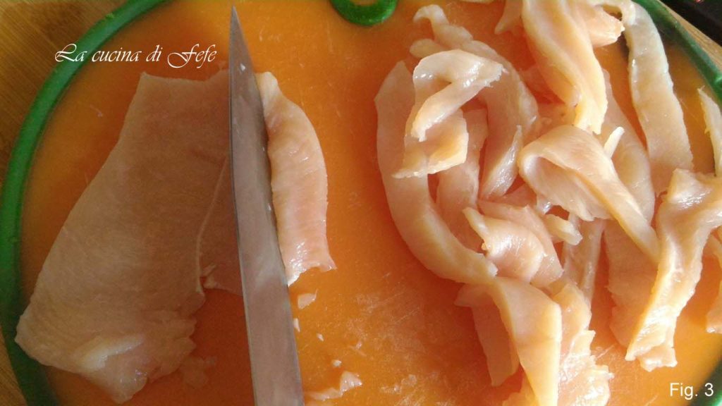Schneiden Sie auf einem Schneidebrett die Hähnchenbrust in Streifen.