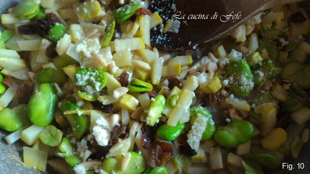🟣Für diejenigen, die eine restriktivere Diät befolgen, kann das Rezept leicht erleichtert werden, indem die Sultaninen und Grundgemüse (Zucchini und Kartoffeln) weggelassen werden, und nur Dicke Bohnen und Hähnchen bleiben. In diesem Fall bereiten Sie eine klassische Gemüsebrühe vor, rösten Sie separat eine halbe Lauchstange und eine Frühlingszwiebel an, fügen Sie die Dicken Bohnen hinzu, löschen Sie mit Apfelessig ab, lassen Sie es verdunsten und gießen Sie dann 2-3 Kellen Gemüsebrühe ein. Lassen Sie es 10-12 Minuten bei schwacher Hitze schmoren. Fügen Sie die Hähnchenstreifen direkt in die Pfanne zu den Pinienkernen hinzu und kochen Sie für weitere 6-8 Minuten maximal. Schmecken Sie mit Salz und Pfeffer ab, schalten Sie ab und würzen Sie nur mit Pecorino-Flocken ohne den Speck, der, wie oben erwähnt, den Geschmack des Gerichts nicht wesentlich verändert. Es wird dennoch köstlich sein!