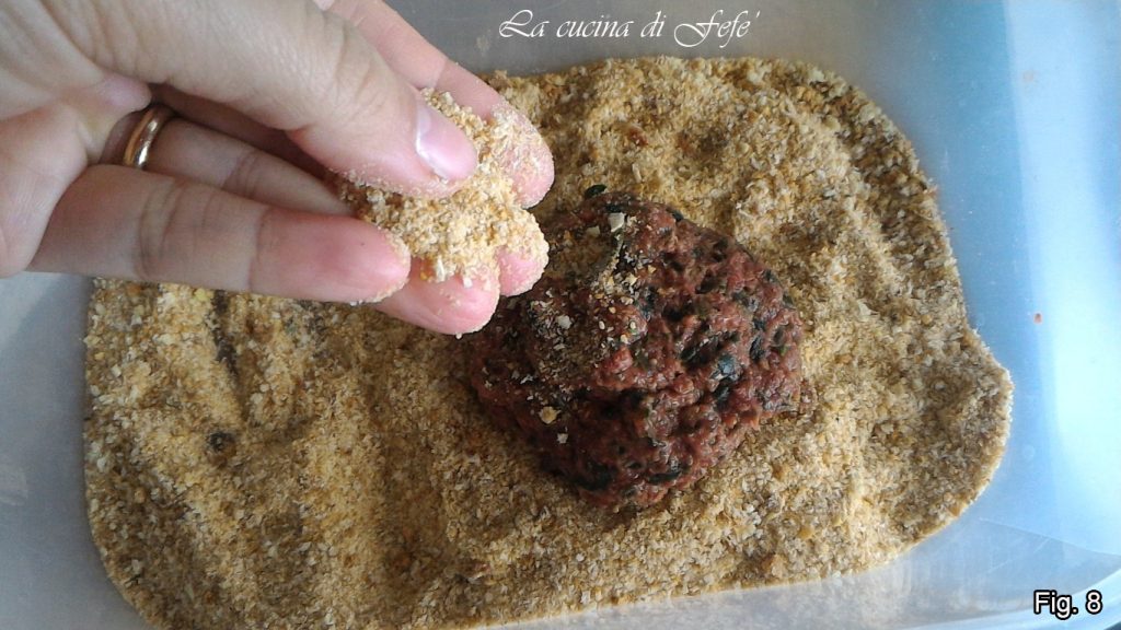 • Beachten Sie, dass der Teig immer noch ziemlich weich bleibt, was absolut normal ist. Dadurch wird sichergestellt, dass sie nach dem Kochen außen knusprig und innen weich sind. Lassen Sie sie 30 Minuten im Kühlschrank ruhen, dann nehmen Sie etwa zwei Esslöffel dieser Masse und geben Sie sie in einen mit Paniermehl gefüllten hohen Behälter. Drücken Sie von beiden Seiten fest, wie Sie es für Hackbällchen tun würden (Abb. 8).