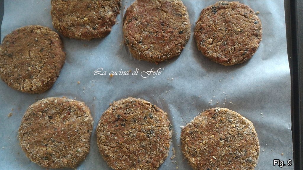• Mit den Händen flachdrücken und abrunden, um die Form eines Burgers zu erhalten, und auf ein mit Backpapier ausgelegtes Backblech legen (Abb. 9).