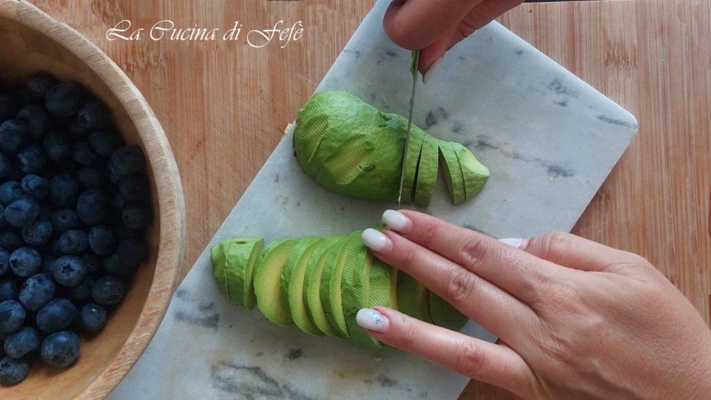 Trockne sie sorgfältig mit Küchenpapier und lege sie beiseite. In der Zwischenzeit schäle die Avocados, entferne die inneren Kerne und schneide sie in dünne Scheiben mit einem Messer.