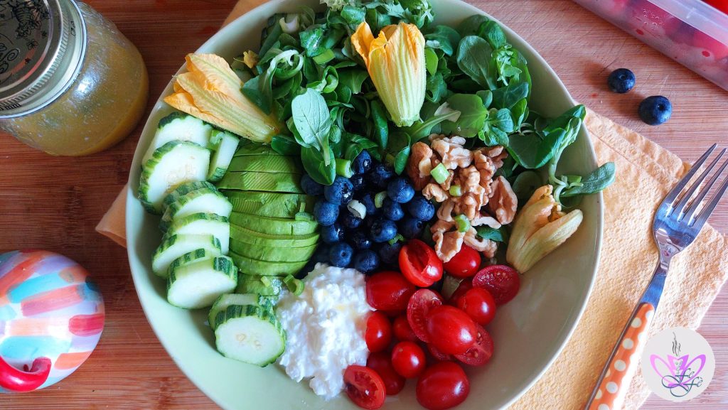 Entgegen aller Erwartungen des allgemeinen Bildes von Salat habe ich mich auch diesmal selbst übertroffen! Wenn ich noch jemanden sagen höre, dass Salate langweilig sind und nur für Diätende geeignet, bringe ich ihm eine Abhandlung über diese oft unterschätzte Art von Gericht! Dabei ist Salat nicht nur das Symbol schlechthin für Gesundheit und Wohlbefinden, sondern wird heutzutage als ein einzigartiges Gericht mit reichhaltigen, sorgfältig abgestimmten Farben und Geschmäckern betrachtet! Kurz gesagt, eine strategische Kombination von Zutaten, die mittlerweile jeden verlocken kann, selbst die Kleinsten! Der heutige Vorschlag ist phänomenal! Der absolute Protagonist ist der Feldsalat, der vielen auch als Vogerlsalat bekannt ist, jedoch nicht mit der gleichnamigen Valeriana officinalis verwechselt werden sollte, die in der Phytotherapie häufig als natürliches Beruhigungsmittel verwendet wird. Diese einjährige krautige Pflanze hat viele gesundheitsfördernde Eigenschaften, sehr wenige Kalorien und viele Ballaststoffe, was sie zu einer großartigen Hilfe für diejenigen macht, die ihre Darmregulierung wiederfinden möchten! Diese Rezeptur wird von Heidelbeeren, super Antioxidantien, Walnüssen, reich an Omega 3 und Omega 6, und Avocado, einer Quelle von Vitaminen, Mineralien und einfach ungesättigten Fettsäuren, umrahmt. Innerhalb der Salatkomposition habe ich Zucchiniblüten hinzugefügt, reich an Carotinoiden, deren Samen im Herbst aus den Überresten verschiedener Kürbisse gepflanzt wurden und heute in großen Mengen wunderschöne Blüten hervorbringen! Die Zugabe von Hüttenkäse garantiert einen Anteil an Proteinen und schließlich bieten die Gurken und Kirschtomaten im ersten Fall entschlackende und entwässernde Eigenschaften und im zweiten eine Anti-Aging-Wirkung. Diese Mischung wird dann mit einem besonderen Dressing veredelt, das dich sicherlich eines Besseren belehren wird! Perfekt als Mahlzeit zum Mitnehmen ins Büro oder, wenn du bereits im Urlaub bist, kannst du sie bequem an den Strand mitnehmen und nach deinem Geschmack variieren!