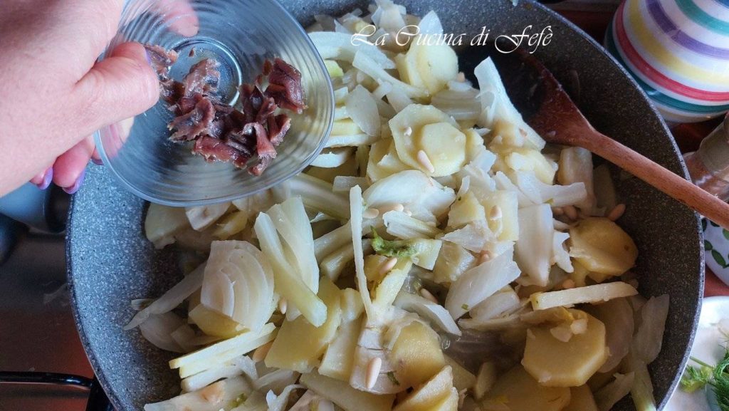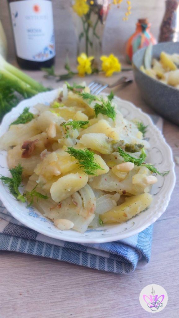 Letzte Gelegenheit, um diese schmackhafte Beilage aus Fenchel und Kartoffeln zu probieren, in der Pfanne gekocht, wirklich einfach und schnell zuzubereiten, also ein perfekter Abendessenretter! Der Frühling steht vor der Tür und bald werden wir einige Wintergemüse wie den Fenchel, der reich an Eigenschaften ist, verschwinden sehen, um Platz für neues saisonales Gemüse zu machen! Also sollte man die Gelegenheit nutzen, sie nach diesem Rezept zu genießen, das außerdem recht kostengünstig ist und hervorragend als schmackhafte Beilage zu all deinen Fleisch- oder Fischgerichten passt! Ich habe diese Beilage mit einem Hauch von sizilianischem Flair bereichert, dank der Zugabe von Pinienkernen und Anchovis in Öl, aber wenn du Vegetarier oder Veganer bist, kannst du sie natürlich weglassen!