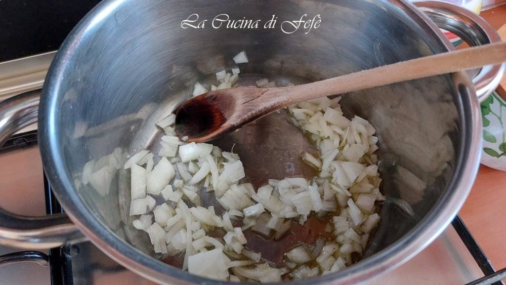 • In einem hohen Topf braten Sie die fein gehackte Zwiebel in einem großzügigen Schuss Öl an.