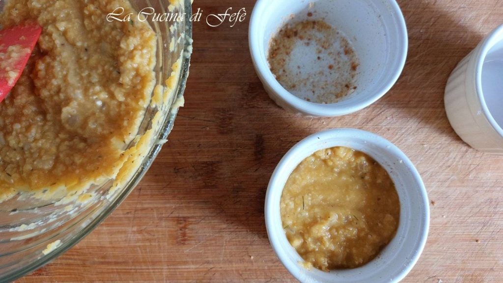 • Legen Sie sie in ein mit heißem (nicht kochendem) Wasser gefülltes Backblech, das bis zur Hälfte der Förmchenhöhe reicht, und backen Sie sie im vorgeheizten Ofen bei 190°C für 30′-35′. Wie bei Kuchen bleibt ein Zahnstocher als Referenz.