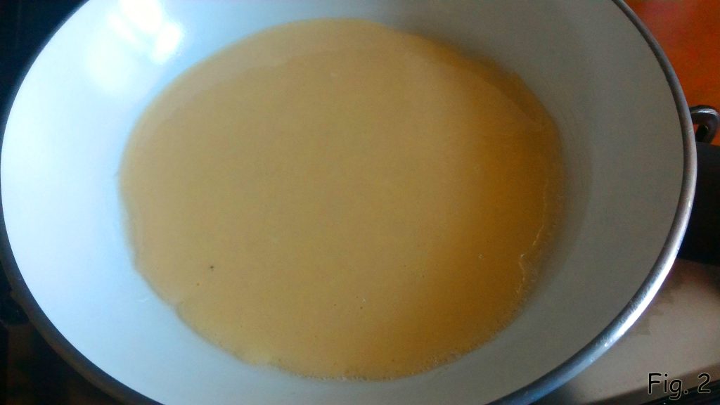 In einer großen Schüssel das Mehl und das Backpulver sieben. Die Eier mit der geschmolzenen Butter mit einem Handrührbesen vermengen. Zucker hinzufügen und weiterarbeiten. Die trockenen Zutaten und die Milch langsam einrühren, dabei darauf achten, dass keine Klumpen entstehen, bis eine glatte und homogene Masse entsteht. Abgedeckt mit einem sauberen Tuch etwa 15 Minuten ruhen lassen, damit das Backpulver aktiviert wird. Dann die Butter sanft in einer kleinen Crêpes-Pfanne erhitzen (Abb. 1).