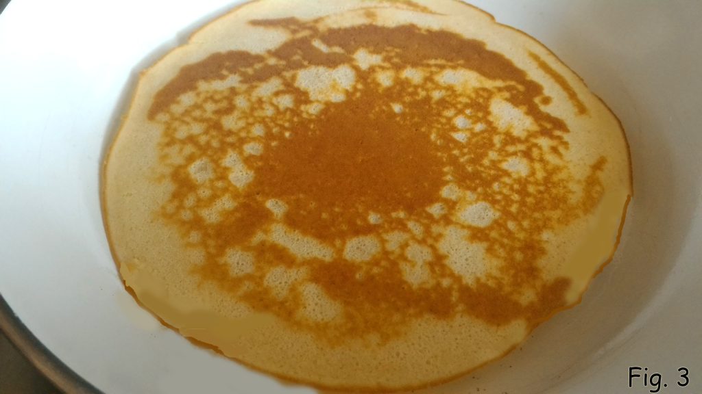 Nach dieser Zeit den Pfannkuchen mit einem Spatel wenden und die andere Seite für eine weitere Minute fertig backen (Abb. 3).