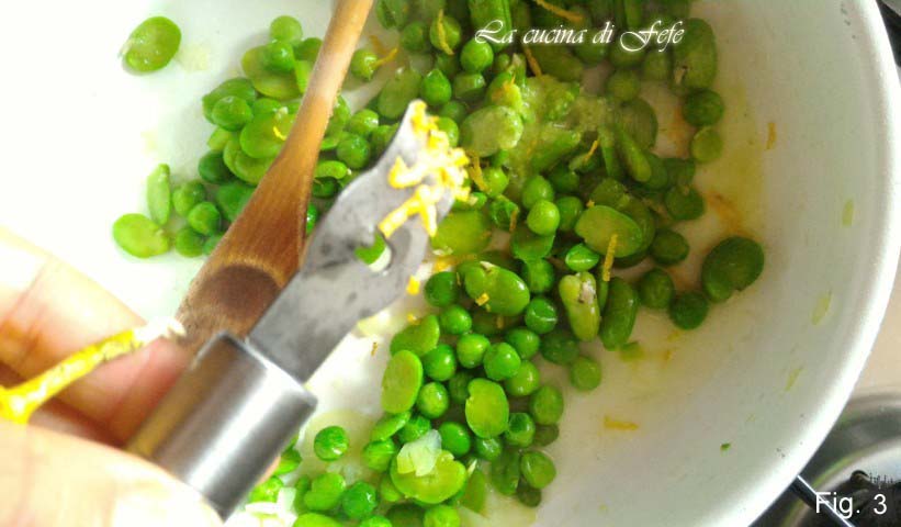 Blanchieren Sie in demselben Wasser der Spargel die Saubohnen und Erbsen für 4 Minuten, dann gut abtropfen lassen. In einer Pfanne 1/2 fein gehackte Zwiebel mit etwas Öl und 2 Esslöffeln Spargelbrühe anbraten. Nach etwa 1 Minute die Saubohnen und Erbsen hinzufügen und weitere 2 Minuten bei schwacher Hitze anbraten (Abb. 2).