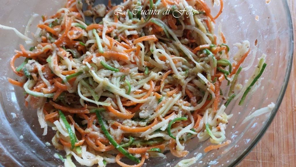 Wer mich kennt, weiß, wie sehr ich es liebe, mit Gemüse zu spielen, um immer wieder neue und optisch ansprechende Gerichte zu kreieren, denn das Auge isst ja bekanntlich mit, oder? Und dieses Rezept ist nicht nur sehr eindrucksvoll, sondern vor allem clever, da es die Möglichkeit bietet, all das übrig gebliebene Gemüse im Kühlschrank zu verwenden oder das, was man vergessen hat, um in kürzester Zeit ein beeindruckendes Abendessen auf den Tisch zu zaubern, das alle überraschen wird! Es genügt, einen Gemüseschäler oder, wie ich, einen Spiralschneider zu haben, um sich zu amüsieren, bunte und schmackhafte Gemüse-Spaghetti zu kreieren, vielleicht zusammen mit den eigenen Kindern, und der Fantasie freien Lauf zu lassen! Ich habe Tomatensauce, Käse und Kirschtomaten hinzugefügt. Einfach, aber wirklich lecker! Man kann sie jedoch mit allem, was der Kühlschrank hergibt, einschließlich des Lieblingsgemüses der Saison, zubereiten. Ein vegetarisches Rezept im Stil, das ganz einfach zuzubereiten ist, wenn man wenig Zeit hat und das auch Kindern angenehm schmackhaft gemacht werden kann.