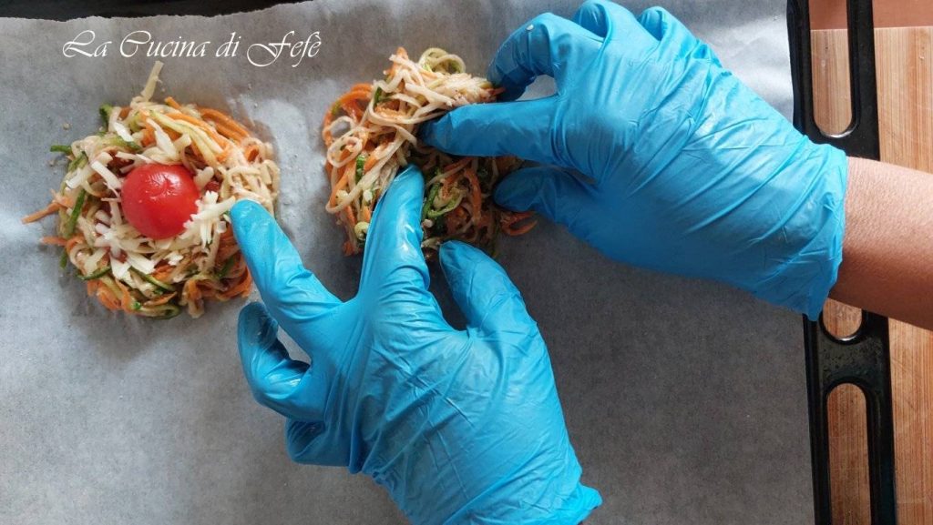 Forme nun die Nester mit den Händen direkt auf einem mit Backpapier ausgelegten Backblech, indem du in der Mitte ein Loch mit den Fingern formst, aber immer mit ein paar Gemüsespaghetti auch am Boden.