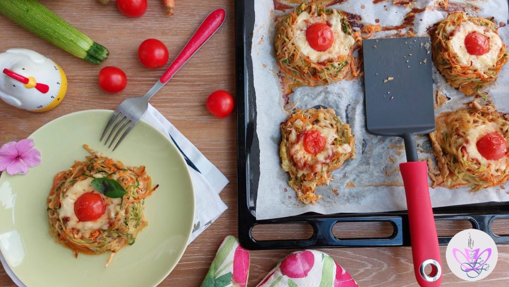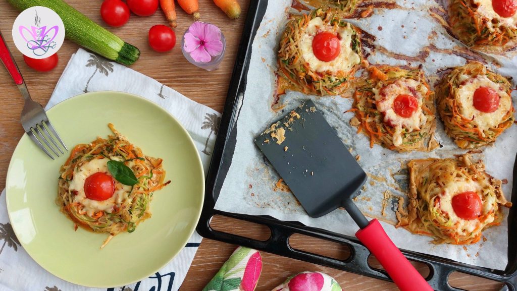 🟣**Als Alternative zum Ofen eignen sich diese Gemüsenester auch sehr gut für die Zubereitung in der Heißluftfritteuse, bei 175°C für 20 Minuten oder in einer Pfanne mit Deckel.