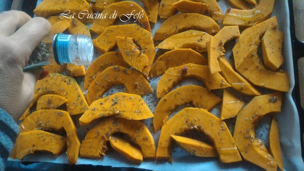 • Lege die Kürbisscheiben auf ein Backblech, das mit Backpapier ausgelegt ist, ohne sie zu sehr zu überlappen, und würze sie mit 2-3 Esslöffeln Öl, Rosmarin, einer Prise Salz und einer Prise Pfeffer.